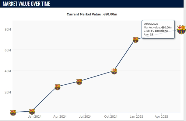 庫(kù)巴西出自于巴薩青訓(xùn),2023年從青年隊(duì)進(jìn)入巴薩一線隊(duì)時(shí),他的身價(jià)只有150萬(wàn)歐。但兩年間他得到了長(zhǎng)足的進(jìn)步,展現(xiàn)了充分的潛力,身價(jià)已經(jīng)暴漲到如今的8000萬(wàn)歐。
