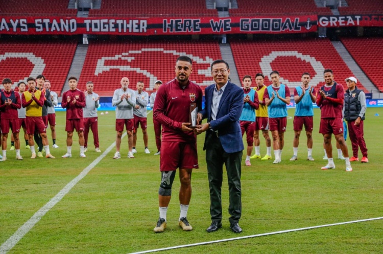今天的官方訓練開始前,俱樂部為兩位球員舉行頒獎儀式。俱樂部總經(jīng)理沙良昌為萊昂納多頒發(fā)第25輪最佳球員獎杯,為李帥贈送百場紀念球衣。