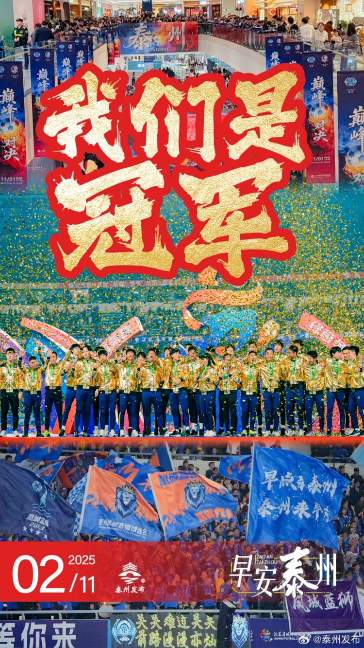 11月2日訊 首屆蘇超落下帷幕,泰州隊(duì)點(diǎn)球擊敗南通隊(duì)奪得冠軍。“泰州發(fā)布”發(fā)文稱:相信相信的力量!相信夢想!相信奇跡!!